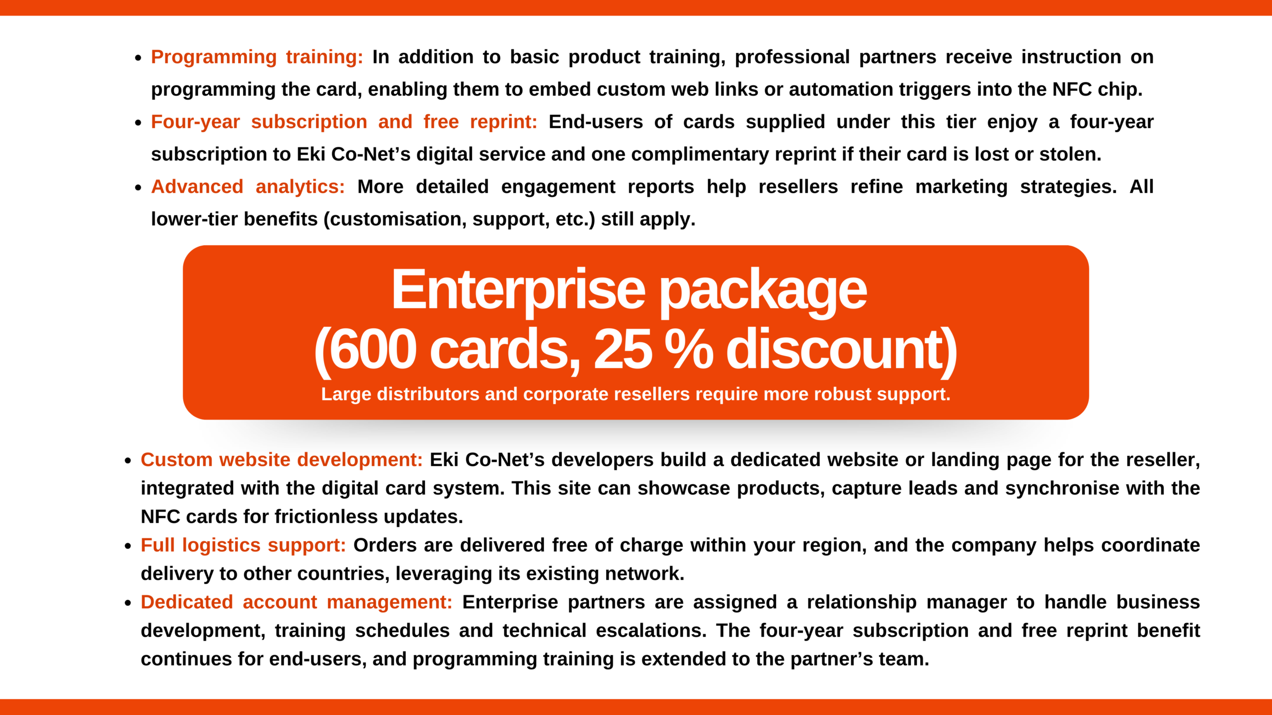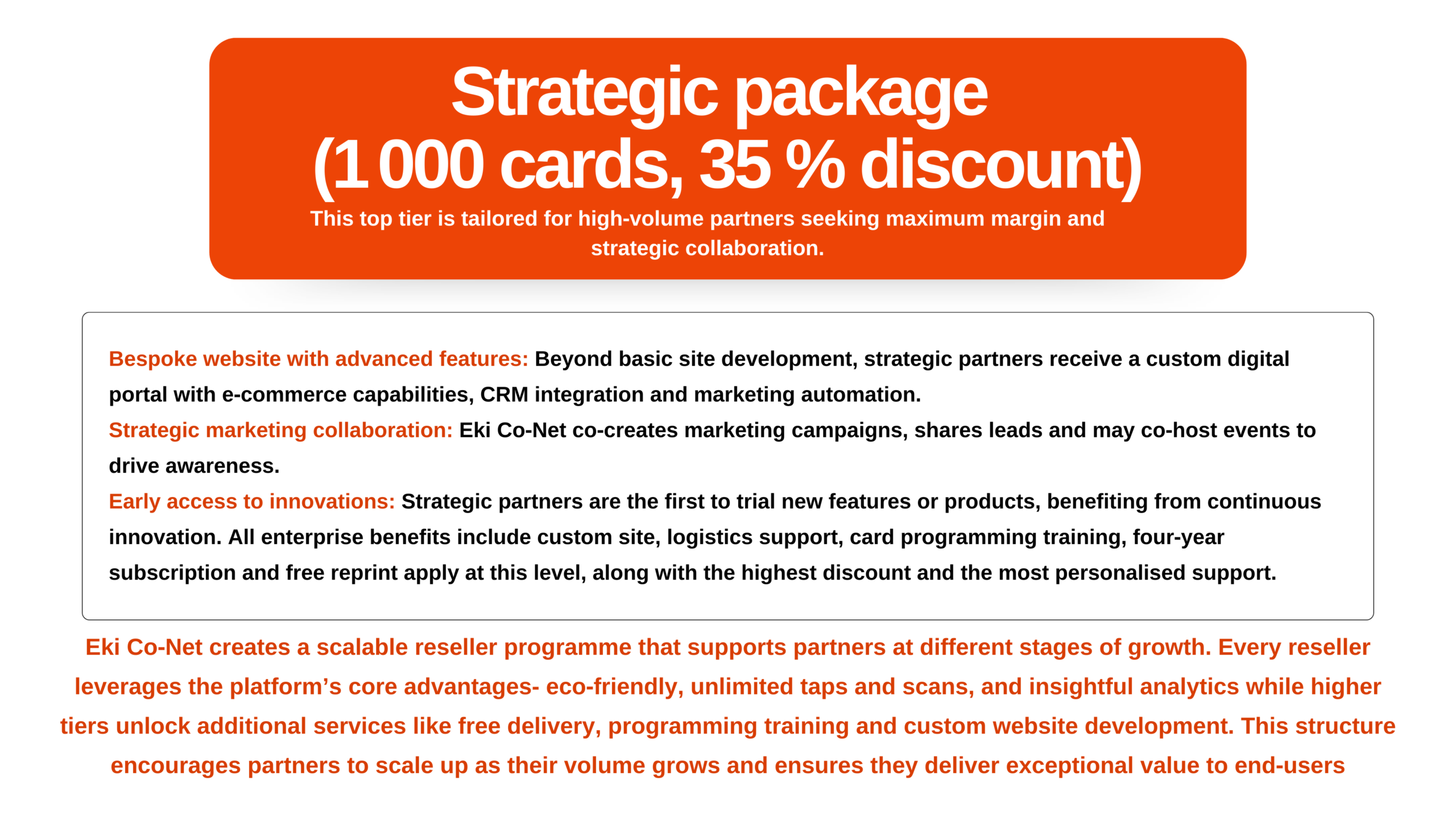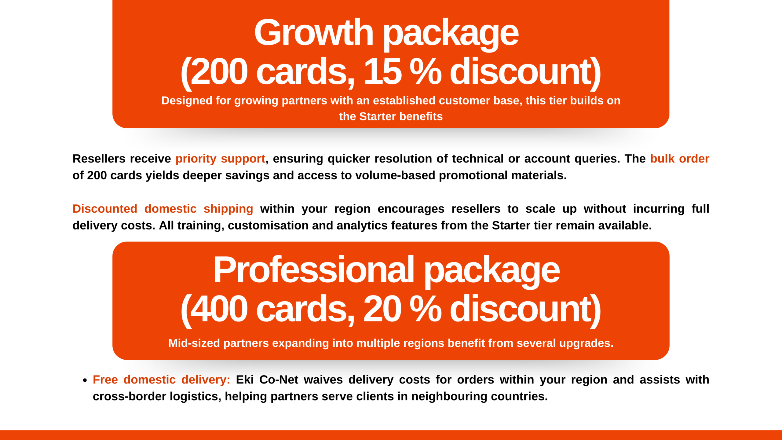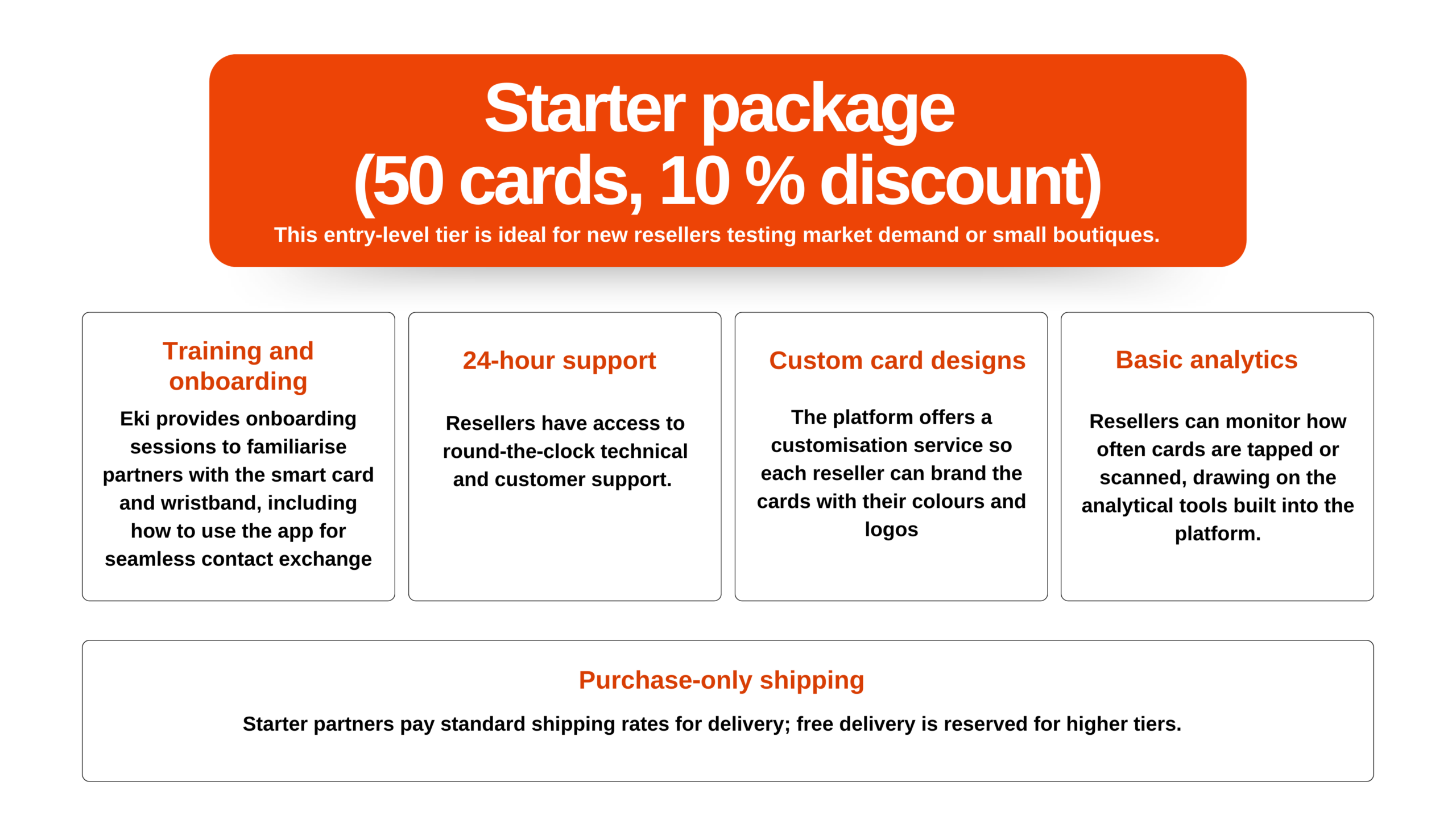 The following five packages are designed to accommodate a wide spectrum of budgets, starting at 50 cards and expanding to 1,000 cards. Each package provides a set discount off the list price of $17 per card/wristband. The per‑card price and total cost shown below are net of discounts. Resellers may upgrade to a higher tier at any time by paying the difference in fees.